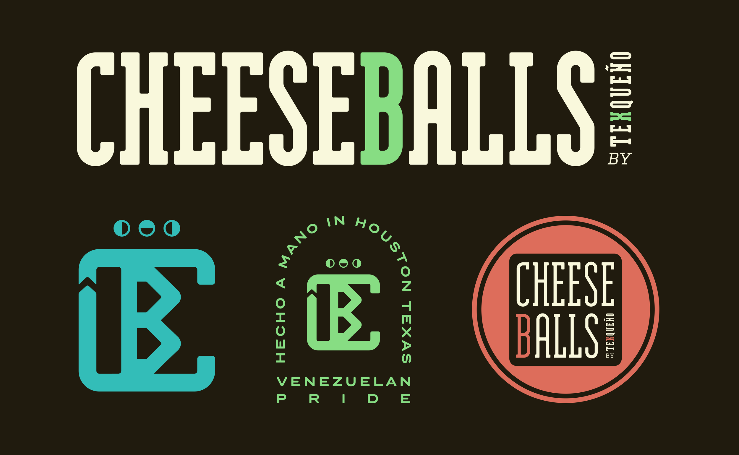 Using the existing “Texqueno” branding, I created a similar artifact collection for the newly catered “Cheeseballs”, focusing on the “C” + “B” to establish brand recognition and utilizing the cross-section of the cheeseball itself as a secondary logo to be used for stickers.