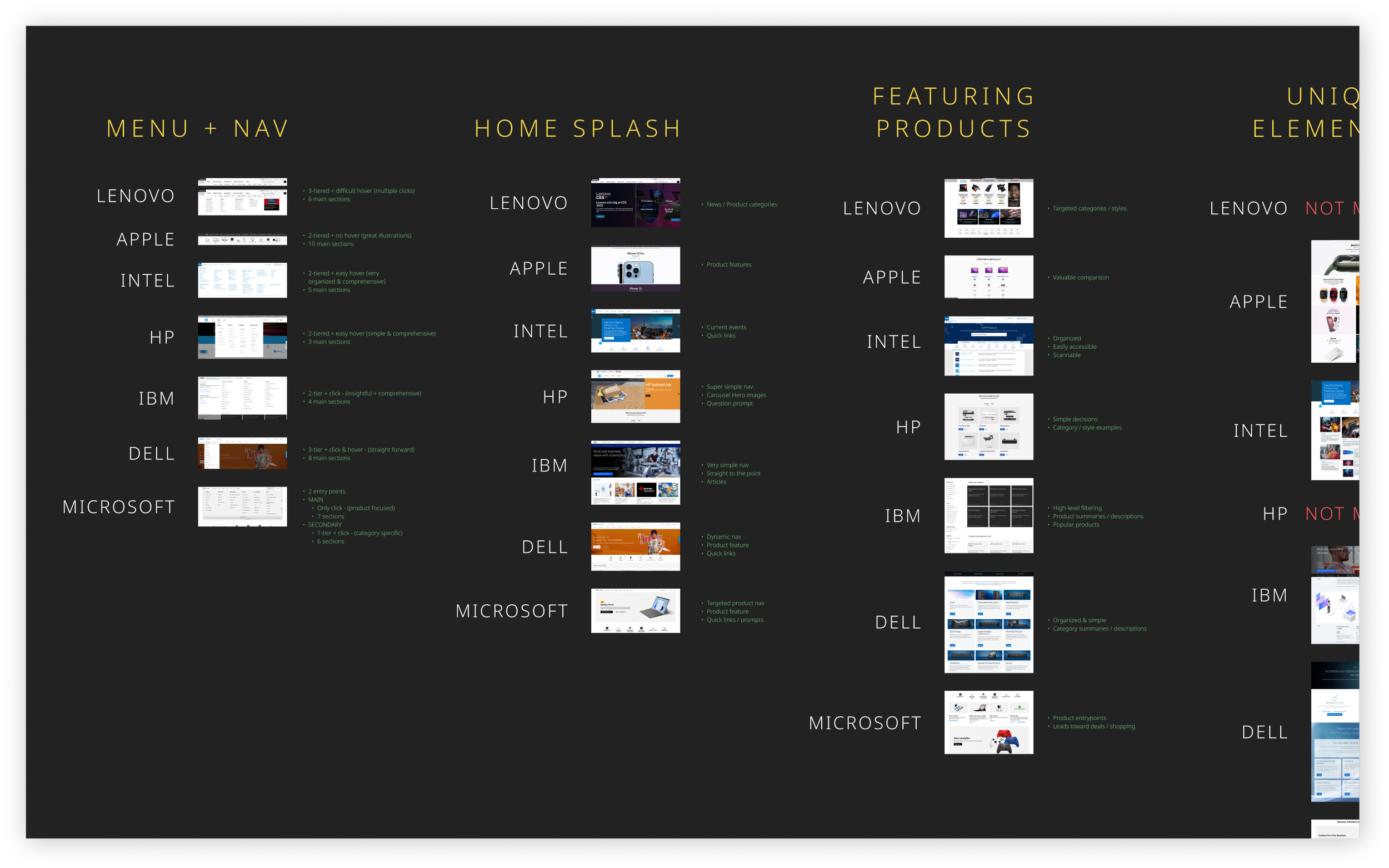 Working with a MAJOR CONSULTING FIRM ON BEHALF OF A FORTUNE 500 TECH COMPANY, I WAS TASKED WITH ASSESSING COMPETITORS TO IDENTIFY WAYS TO MODERNIZE THEIR WEBSITE TAXONOMY & DEVELOP CONCEPTUAL IDEAS FOR A NEW LOOK