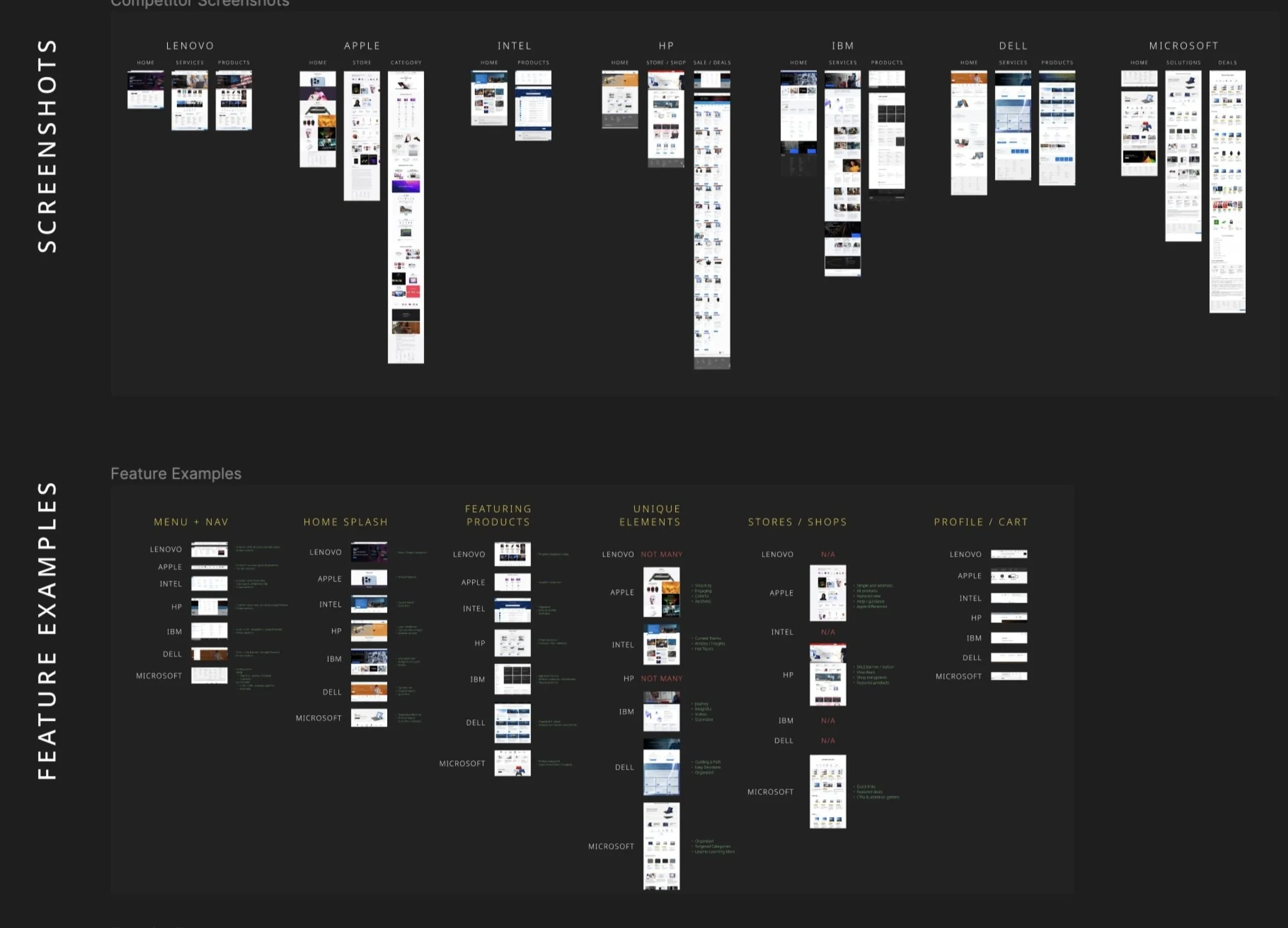 The initial approach centered around conducting a competitive analysis to see what features and layout similar tech companies present in their website homepages and site navigation.
